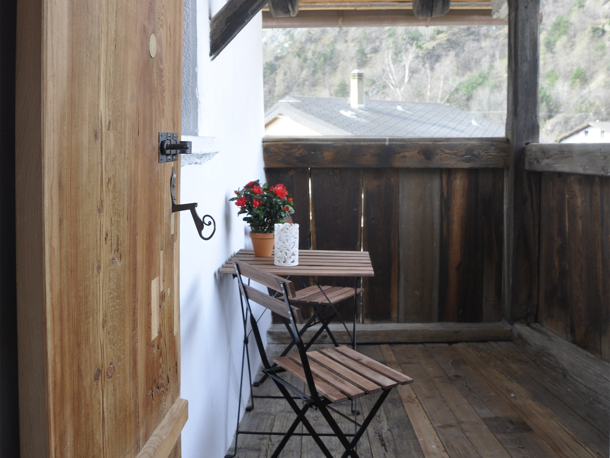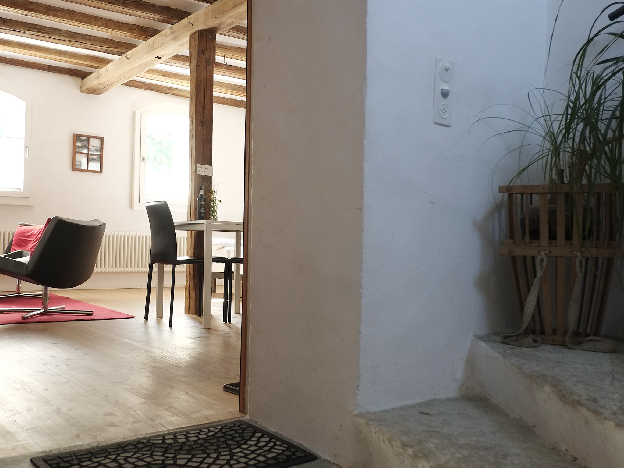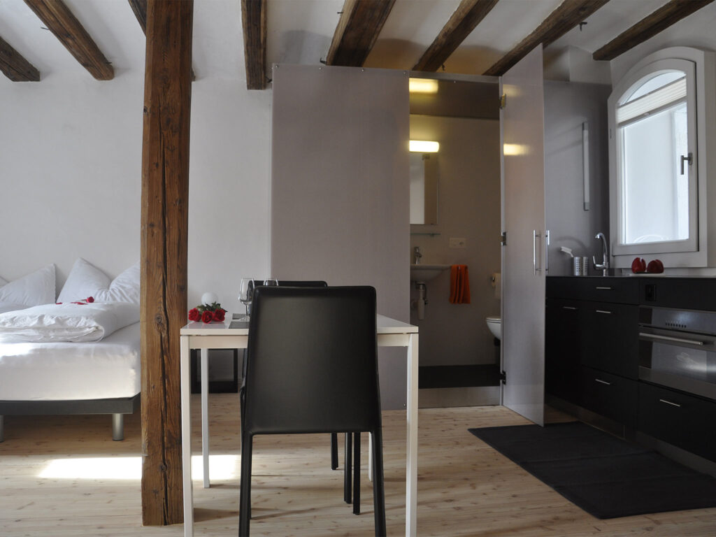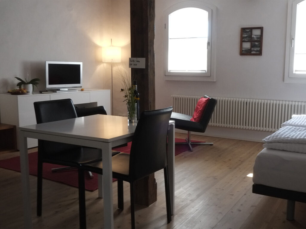 Die kleine Wohnung erwartet Sie mit einem stilvoll eingerichteten Ess- und Wohnbereich. Die historische original Bausubstanz trifft auf zeitgemässe Möbilierung und Infrastruktur, mit komfortablern Hüsler-Naturbetten und mit einer kleinen Küche. Free WiFi und ein Flachbild-TV sind selbstverständlich. Ihr Bad ist mit einer Dusche ausgestattet. Die vorgelagerte Veranda lockt mit Aussicht über das Dorf und die lokalen Berge. Für Fotos «weiterlesen»