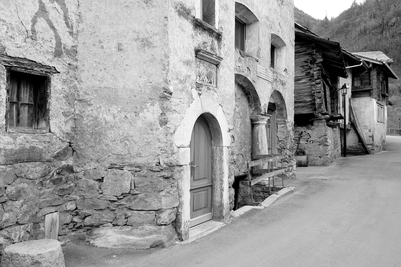 Stil: Typisches Turtmänner Patrizierhaus mit vorgebautem Treppenturm. Sogenanntes Mantelmauerhaus, Holz-Blockbau mit verputztem Mauerwerk.